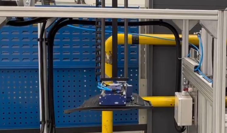 To automate the sorting and transport of floor mats, VICIM implemented an igus line gantry system with an integrated Y and Z axis. The Y-axis features a drylin® ZLW-20200 toothed belt axis, driven by a NEMA24 stepper motor with encoder and gear, offering precise motion with a feed of 144 mm/rev. The Z-axis utilizes a drylin® GRR-20120 cantilever axis, also driven by a NEMA24 stepper motor with encoder and brake, providing a feed rate of 72.26 mm/rev. A pneumatic end effector ensures secure gripping of the mats, allowing them to be transported over longer distances without dropping, highlighting the gantry's reliability in handling large items.